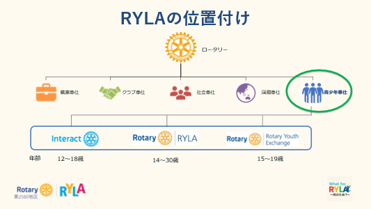 RYLAは、地域社会の若い人々の指導力および善良な市民としての資質や個人の能力を伸ばすことにロータリアンが直接寄与できる機会を設けること