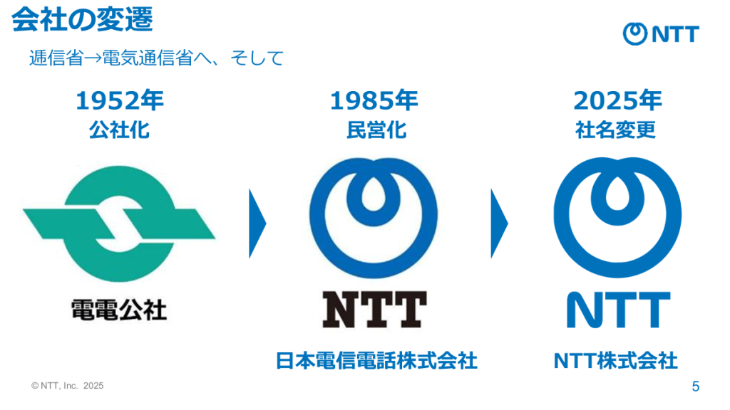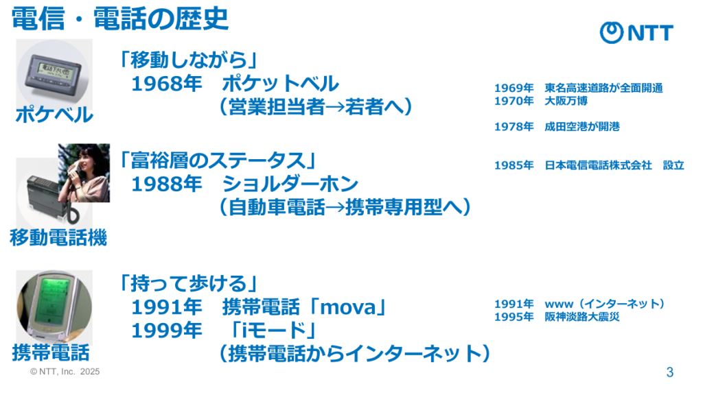 2025年は昭和100年、戦後80年、そして弊社が民営化して40年の節目となりました。この節目の年として、きょうは「それぞれの歩み」と題して、電話のこと、会社のこと、そして自分自身のことを、順を追ってお話します。