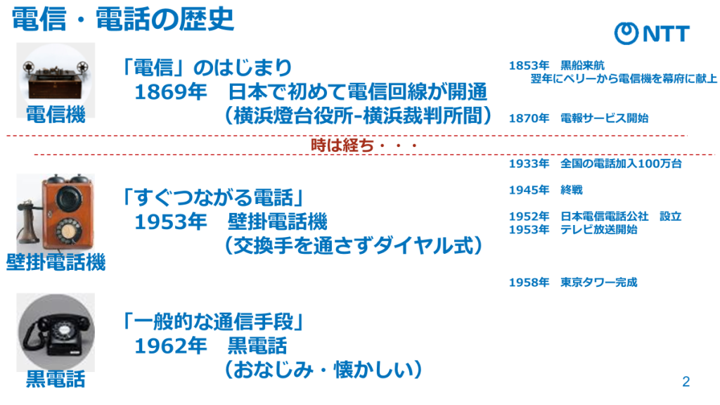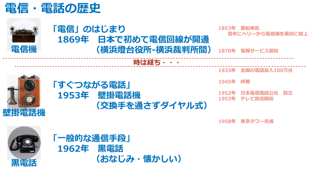 まず、電信・電話の歴史です。遡ることペリー来航の頃からとなりまして、幕末から明治にかけて日本で初めて電信回線が開通しました。ここから時が経ち、「すぐつながる電話」となったのが1950年代、これまで電話交換手を通していた通話も、ダイヤルを回すことで相手に電話ができるようになりました。みなさんも壁掛電話機を見られたり、実際に使われたりされたこともあったかと思います。そして1960年代に入り、おなじみの黒電話が登場。この頃には電話が「一般的な通信手段」となっていきました。わたしが初めて使った 電話もこの黒電話、そして何よりも通話品質が良く、会社の先輩方・OB等の方々からも黒電話の思い出をよく伺います。