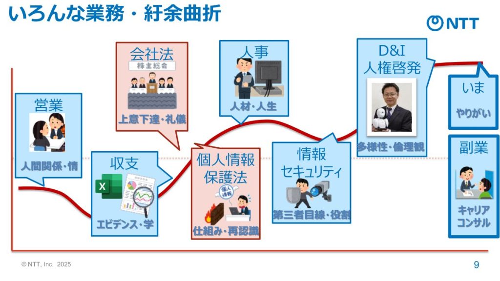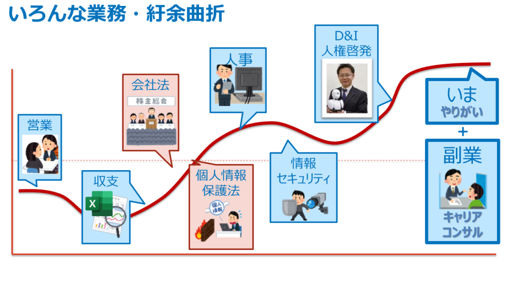 仕事としては、これまで営業、経営戦略、法令対応、人事、セキュリティ、そしてダイバーシティ&インクルージョンの分野を経験し、いまの仕事に至っています。また、副業のキャリアコンサルタントとしては、さまざまな方とともにキャリアについて考える機会があり、やりがいを感じている現在です。
