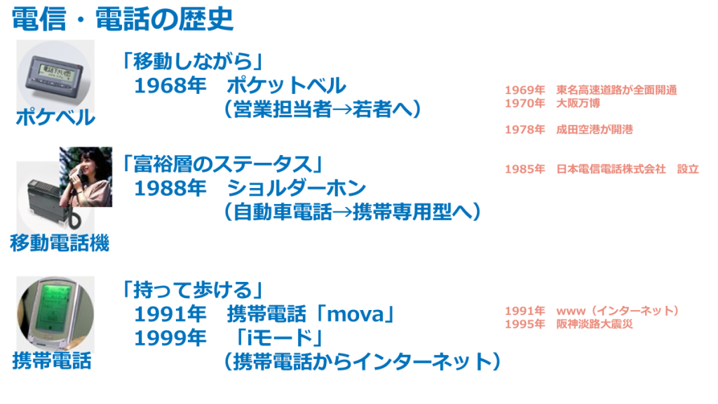 そしてここから技術の進歩が目まぐるしく、1960年代後半にはポケットベルが登場し、「移動しながら」連絡が取れる環境となりました。当時は主に営業担当者が利用していましたが、すぐに若者に拡がり、公衆電話でプッシュボタンを押して相手にメッセージを届けるシーンなど、懐かしい話です。さらには「富裕層のステータス」である自動車電話、携帯型のショルダーホンが登場しました。両手で使うくらい大きな物で、いまでは考えられない大きさです。さらに、いよいよ「持って歩ける」携帯電話の登場です。すでにガラケーと言われていますが、携帯電話でインターネットが利用できるなど、画期的なところもありました。ちょっとビジネスでは浮き沈みが激しかったiモードなどもこの頃に登場したサービス です。