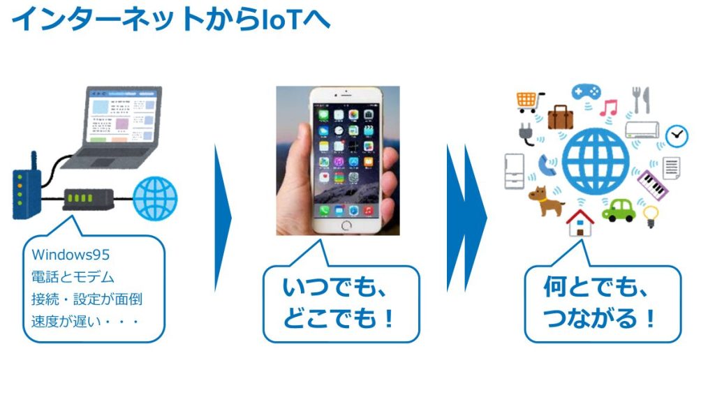 そして一気にインターネット時代。最初は大きなPCを電話とモデムで接続し、特に「ピー、ヒョロロロ~」というダイヤル接続の音を鳴らしながらインターネットに接続するのを待ったことを今でも 覚えています。いまではみなさんもお使いのスマホ、そしてさらにインターネットの世界はPCやスマホだけでなく、あらゆる機器と接続されています。ATMやクレジットカードでお金のやり取りができたり、信号機が制御できたり、「何とでもつながる」そんな世の中になりました。