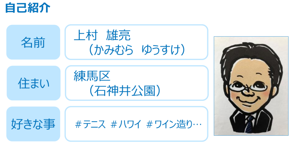ここでわたし自身のことにも触れていきます。わたしは苗字も名前も読んでいただけないことが多いので、名刺などには必ずふりがなを入れ、話題にして自己紹介しています。住まいは練馬区・石神井公園、好きなことはテニス、最近行けなくて残念ですがハワイ旅行、そして練馬でワイン造りをしています。練馬で育てるブドウ、そしてそのブドウを潰してワインを醸造していく活動に、ボランティアとして参加しています。