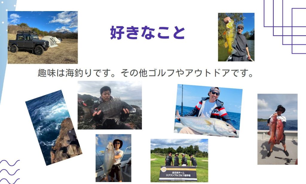 そして、趣味・好きなことは“海釣り”です。 その他ゴルフや アウトドアも好きです。